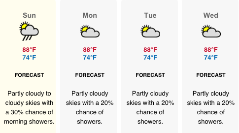 UV: 11.0 EXTREME (Same as yesterday) Expected temperatures – 78°F to 88°F. Yesterday: H 87.5°F L 74.6°F