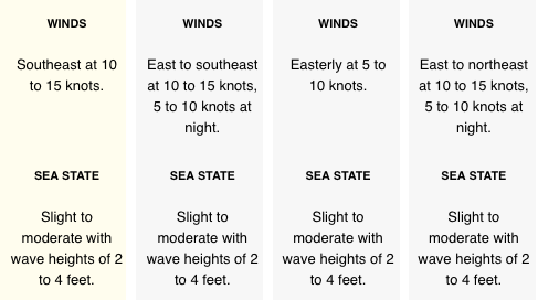 Mostly cloudy skies early, then partly cloudy this afternoon.Tonight, a few clouds. Slight to moderate seas.