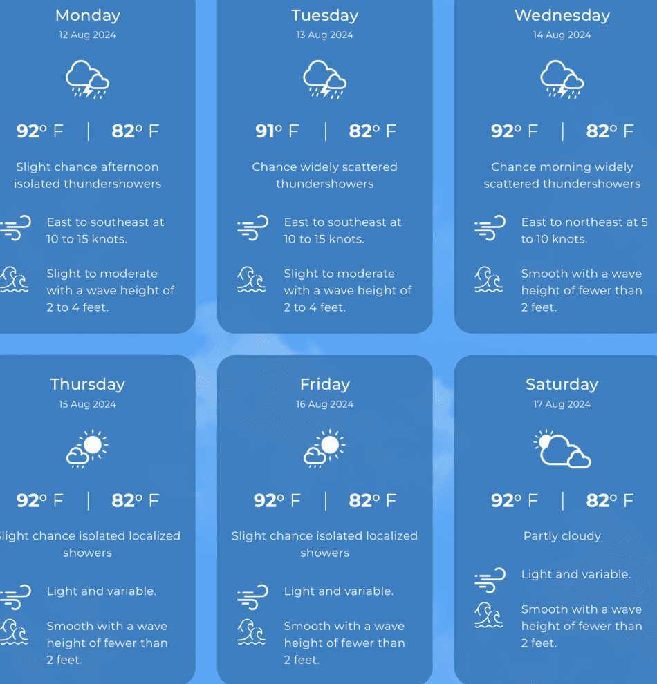 Light to moderate easterly winds and seas are expected across the Cayman area today as a weak pressure gradient lingers over the northwest Caribbean. The CINWS notes the tropical wave over the Central Atlantic that the National Hurricane Center suggests has a moderate to high chance of developing into a tropical storm between the next 2 to 7 days. This system poses no threat to the Cayman Islands.