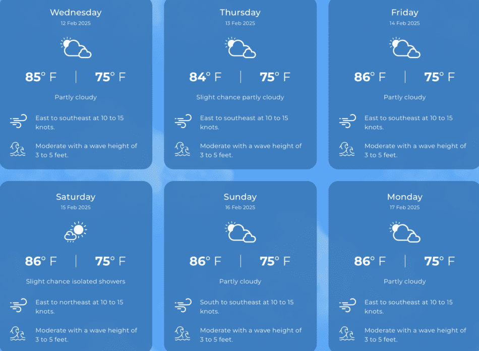 Expected temperatures: 75°F to 84°F. Yesterday: H 85.0°F L 75.2°F