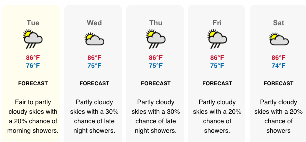 Temperature: Today’s expected temperatures – 76°F to 87°F. Yesterday: H 86.6°F L 75.7°F