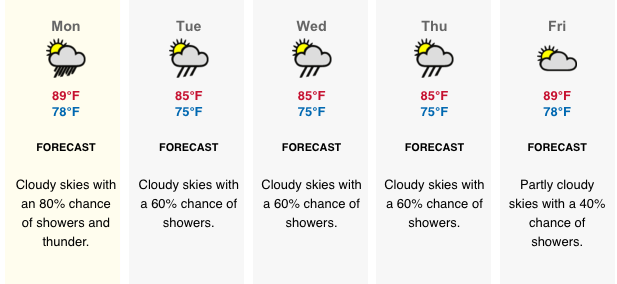 Temperature: Today’s expected temperatures – 73°F to 87°F. Yesterday: H 86.8°F L 75.3°F