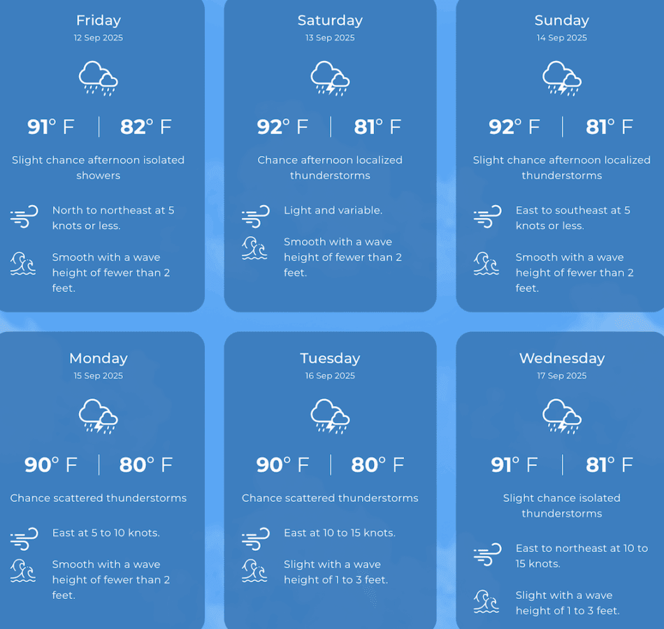 Expected temperatures: 80°F to 91°F. Yesterday: H 91.3.°F L 81.0°F