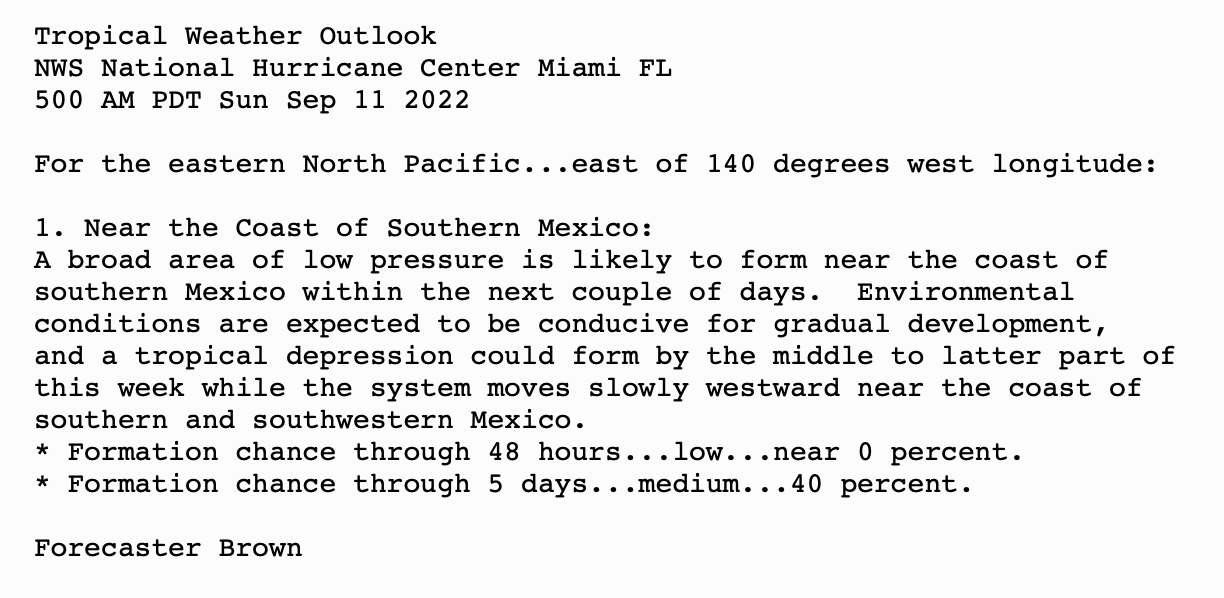 | Tropical Weather Outlook 500 AM PDT Sun Sep 11 2022 Tropical Weather Discussion 1005 UTC Sun Sep 1 2022 | |