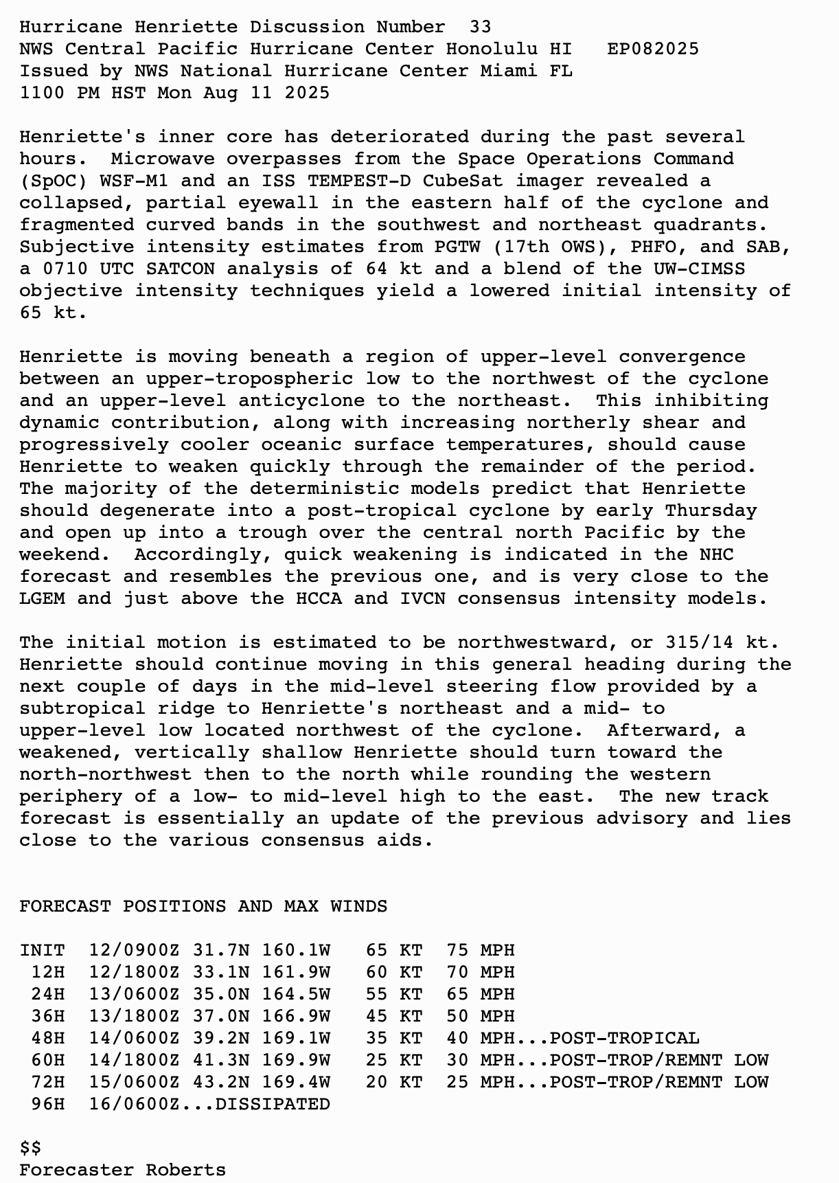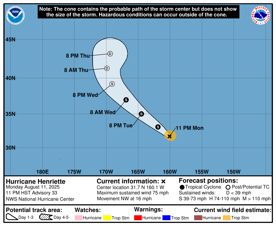 SMALL HURRICANE HENRIETTE EXPECTED TO WEAKEN FURTHER WHILE MOVING OVER THE CENTRAL NORTH PACIFIC