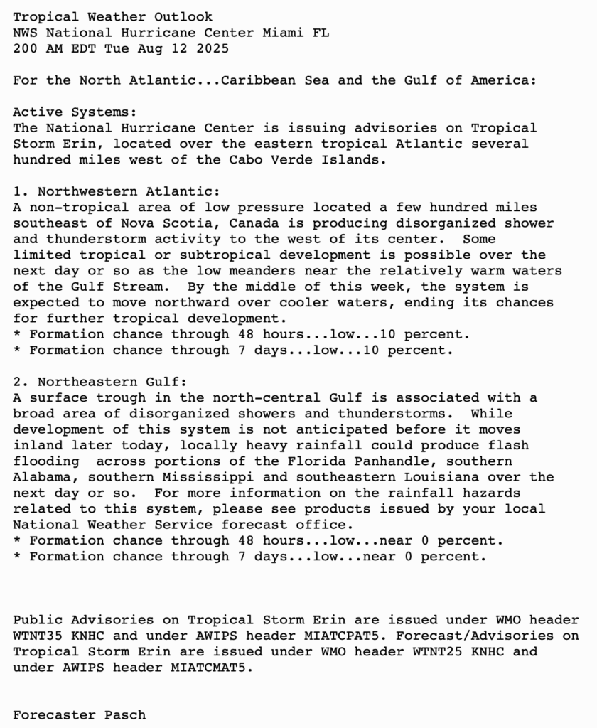 | Tropical Weather Outlook 800 AM EDT Tue 12 Aug 2025 1205 UTC Tue 12 Aug 2025 | |