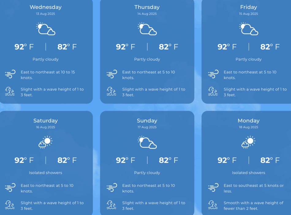 IMPORTANT NOTICEThe times reflected in the tidal table for Grand Cayman are predictions valid as references for sports fishing in areas near the coast of Grand Cayman. THEY ARE NOT SUITABLE FOR NAVIGATION. Remember that to practice any activity at sea like diving, windsurfing and fishing from a boat or underwater fishing should always be consulted with the official tide tables of the port of Grand Cayman.