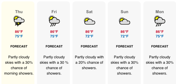 Temperature: Today’s expected temperatures – 75°F to 87°F. Yesterday: H 86.0°F L 76.8°F