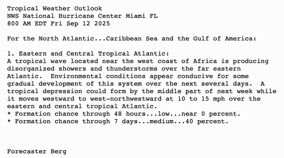 | Tropical Weather Outlook 800 AM EDT Fri 12 Sep 2025 1205 UTC Fri 12 Sep 2025 | |