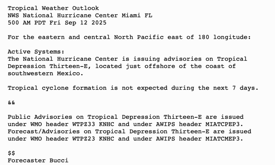 | Tropical Weather Outlook 500 AM PDT Fri 12 Sep 2025 1005 UTC Fri 12 Sep 2025 | |