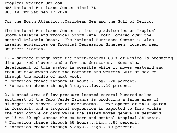 | Tropical Weather Outlook (en Español*) 800 AM EDT Sat Sep 12 2020 |