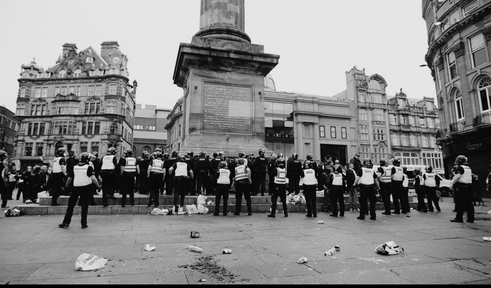 On the 13th June 2020, 2 groups of protestors head to the Monument in Newcastle. The ‘Defenders of Newcastle’ and a Black Lives Matter (BLM) demonstration. I was standing in solidarity with the BLM movement which consistently remained positive and in good spirits with music, dancing and chants. I have only attended one protest before this demonstration which was for the same movement and held at the same location in Newcastle just a week prior. Upon arriving at Monument I came into contact with the counter protest which I didn’t know was going ahead. The difference in attitude was apparent. I immediately joined the BLM movement. The counter protestors were heavily drinking throughout the day. Bottles and flares were thrown towards the BLM protestors before the counter-protestors later began targeting police. Riot police were brought in along with police horses and dogs; all of which were targeted. My intention with these photos was simply to raise awareness and document my experience at the demonstration.