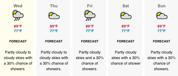 Temperature: Today’s expected temperatures – 77°F to 90°F. Yesterday: H 91.0°F L 76.5°F