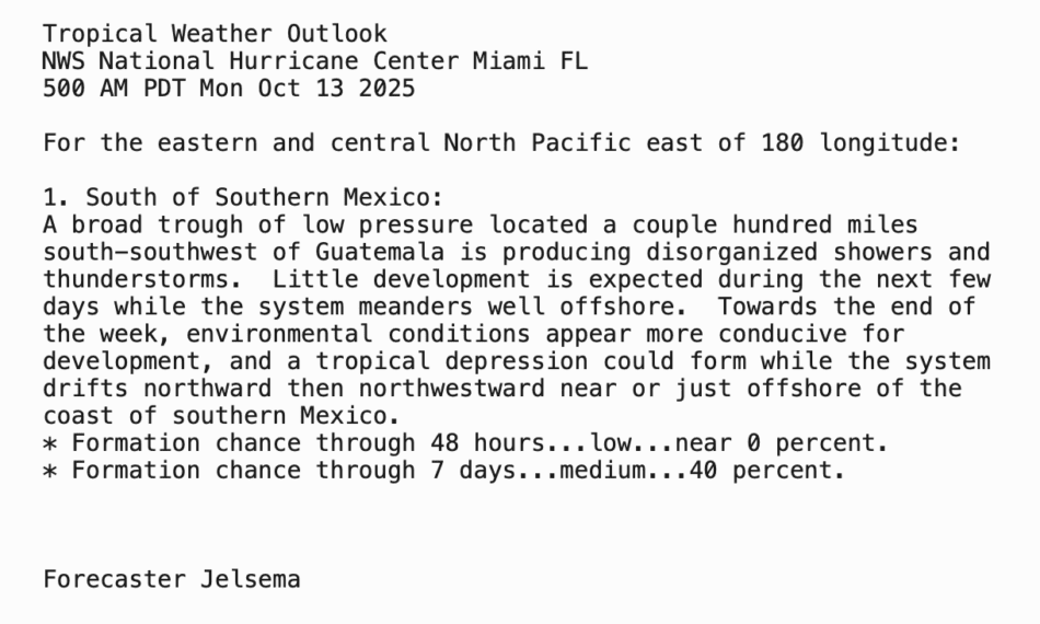 | Tropical Weather Outlook 500 AM PDT Mon 13 Nov 2025 1005 UTC Mon 13 Nov 2025 | |