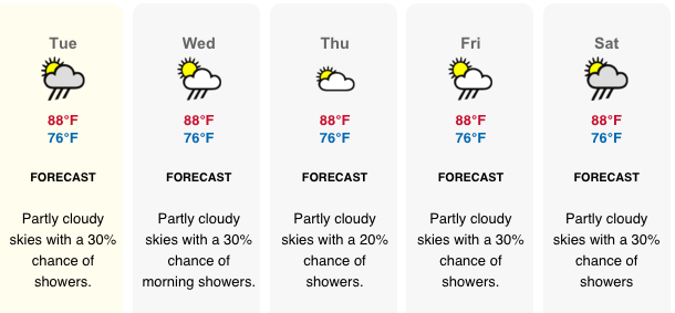 Temperature: Today’s expected temperatures – 81°F to 89°F. Yesterday: H 90.0°F L 71.3°F
