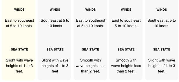 Winds: Today: SE 10-15 mph Tonight: SE 5-10 mph