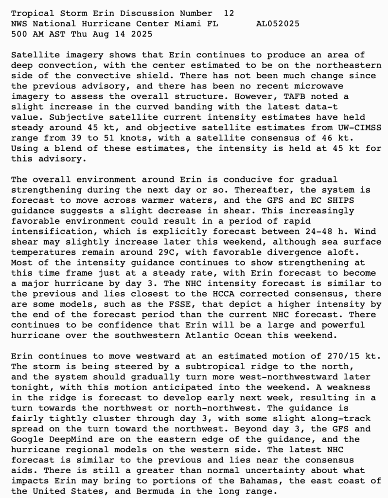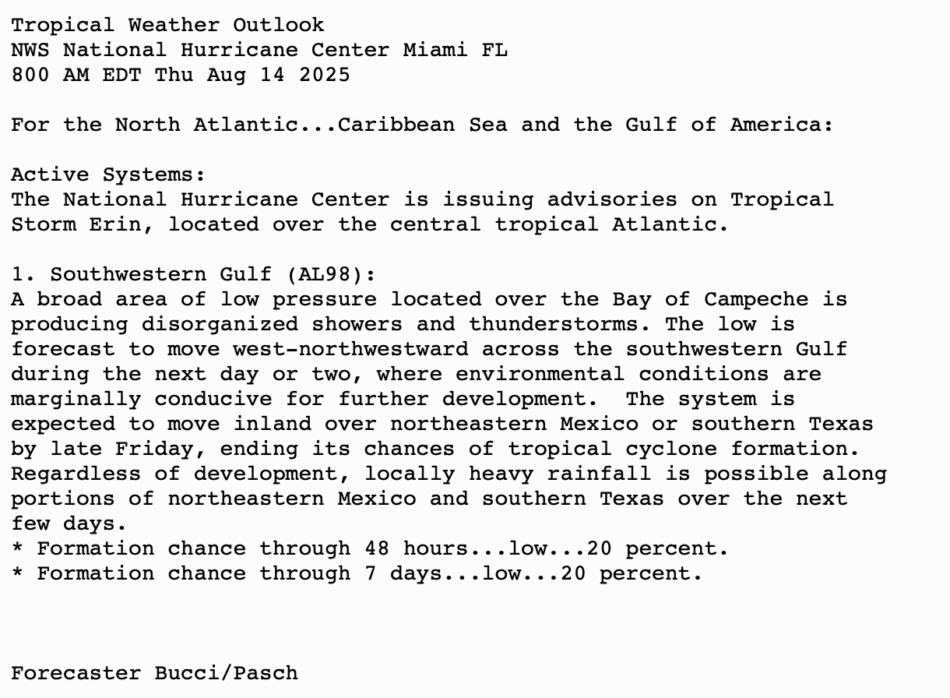 | Tropical Weather Outlook 800 AM EDT Thu 14 Aug 2025 1205 UTC Thu 14 Aug 2025 | |