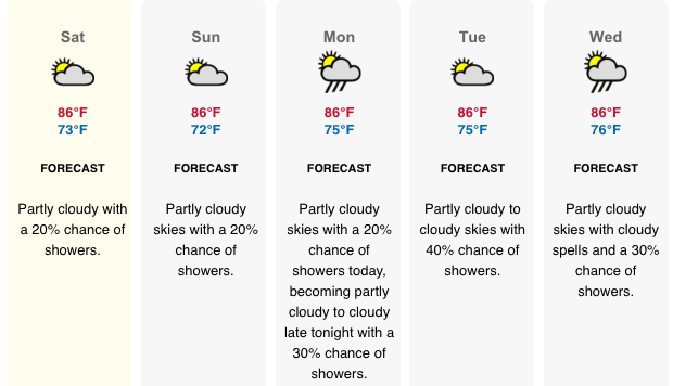 Temperature: Today’s expected temperatures – 73°F to 87°F. Yesterday: H 87.7°F L 74.1°F