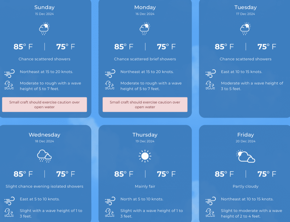 Expected temperatures: 75°F to 85°F. Yesterday: H 84.8°F L 74.2°F