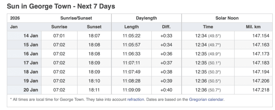 IMPORTANT NOTICEThe times reflected in the tidal table for Grand Cayman are predictions valid as references for sports fishing in areas near the coast of Grand Cayman. THEY ARE NOT SUITABLE FOR NAVIGATION. Remember that to practice any activity at sea like diving, windsurfing and fishing from a boat or underwater fishing should always be consulted with the official tidetables of the port of Grand Cayman.