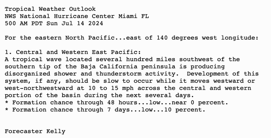 | Tropical Weather Outlook 500 AM PDT Sun 14 July 2024 Tropical Weather Discussion 1005 UTC Sun 14 July 2024 | |
