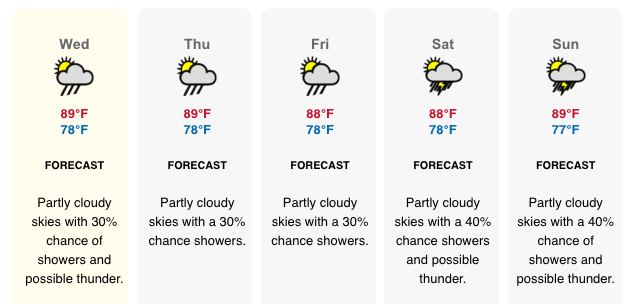 Temperature: Today’s expected temperatures –78° to 90°F. Yesterday: H 89.6°F L 79.7°F