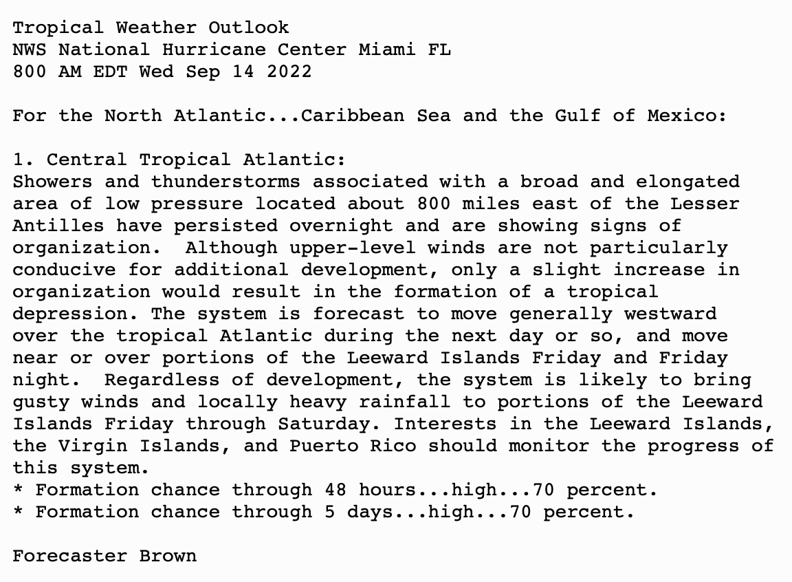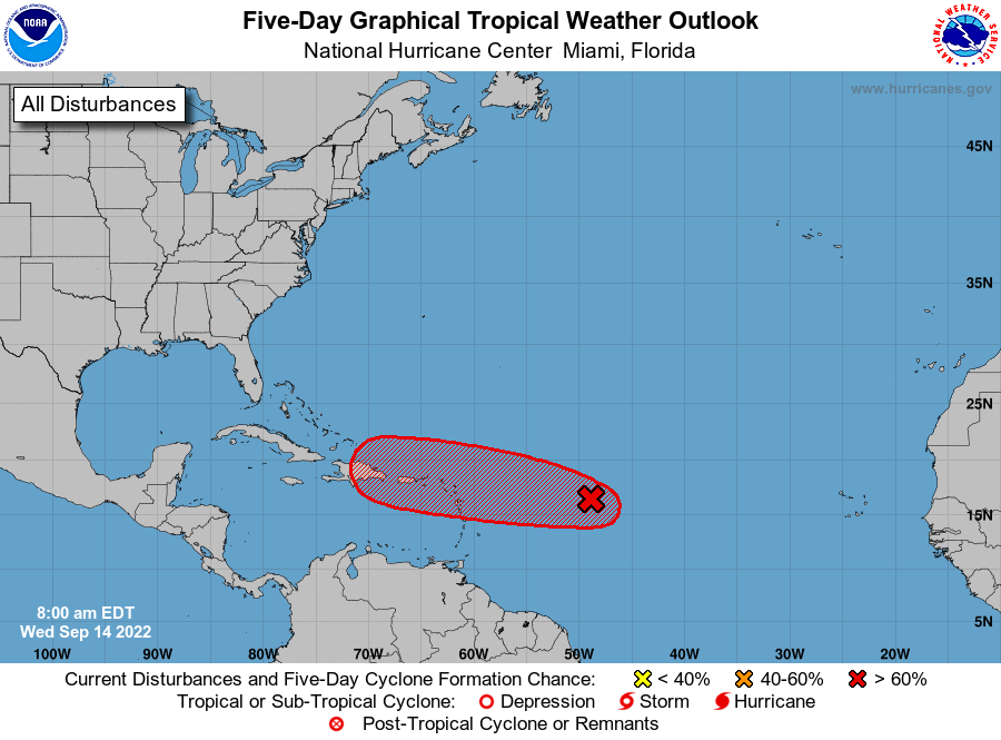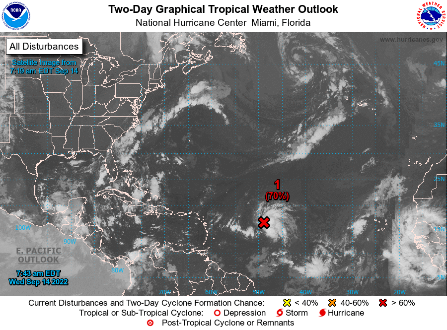 | Tropical Weather Outlook (en Español*) 800 AM EDT Wed Sep 14 2022 1205 UTC Wed Sep 14 2022 | |