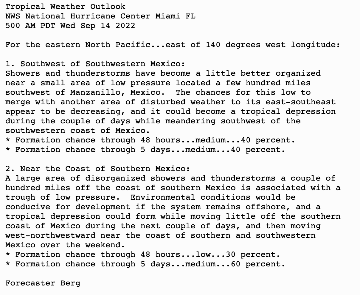 | Tropical Weather Outlook 500 AM PDT Wed Sep 14 2022 Tropical Weather Discussion 1005 UTC Wed Sep 14 2022 | |