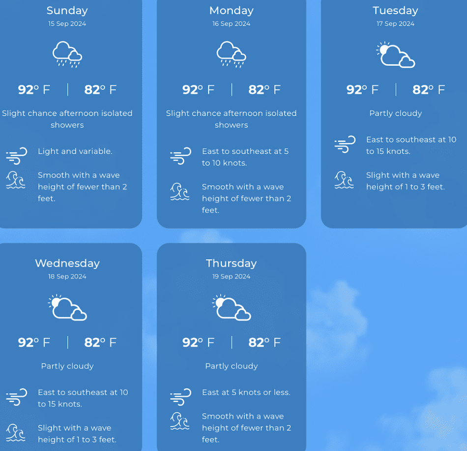 Protection required – UV damages the skin and can cause sunburn. Reduce time in the sun between 11 a.m. and 3 p.m. and take full precaution by seeking shade, covering up exposed skin, wearing a hat and sunglasses, and applying sunscreen.Expected temperatures: 92°F to 82°F. Yesterday: H 91.6°F L 81.7°F