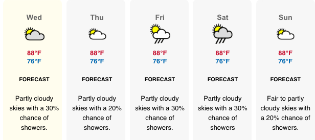Temperature: Today’s expected temperatures – 80°F to 89°F. Yesterday: H 89.2°F L 80.4°F