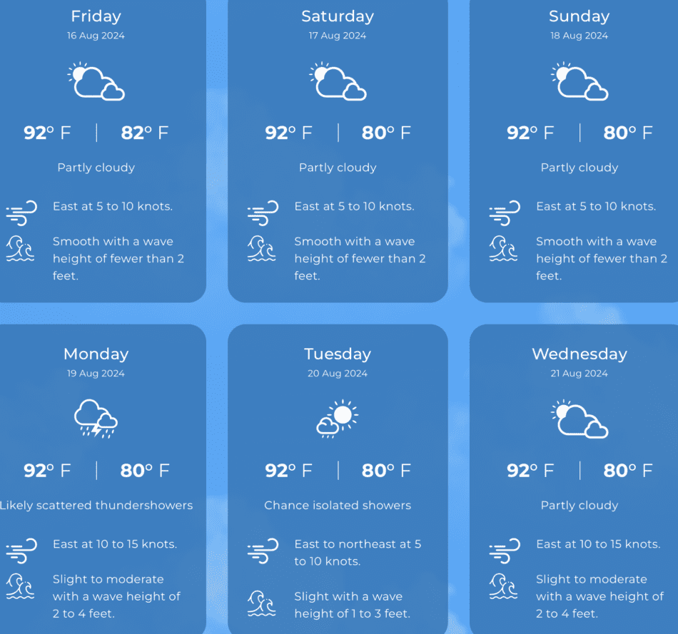 Expected temperatures: 82°F to 92°F. Yesterday: H 91.8°F L 82.3°F