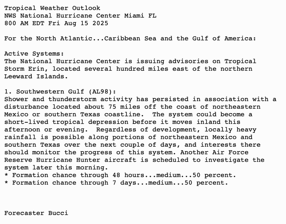 | Tropical Weather Outlook 800 AM EDT Fri 15 Aug 2025 1205 UTC Fri 15 Aug 2025 | |