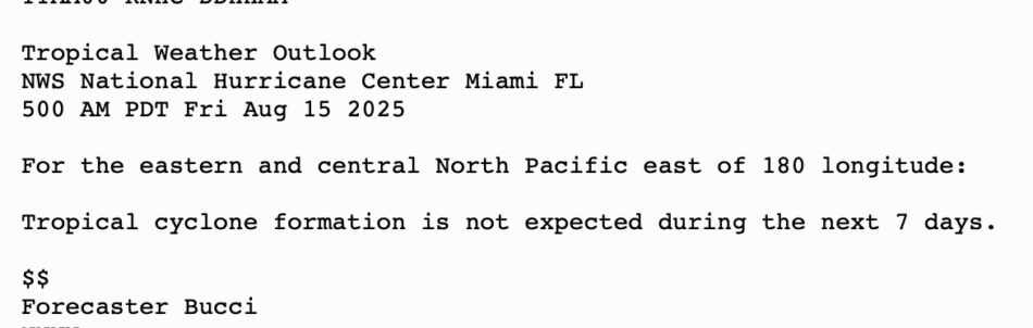| Tropical Weather Outlook 500 AM PDT Fri 15 Aug 2025 1005 UTC Fri 15 Aug 2025 | |