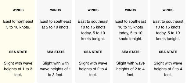 Winds: Today E 5-10 mph Tonight Light & variable