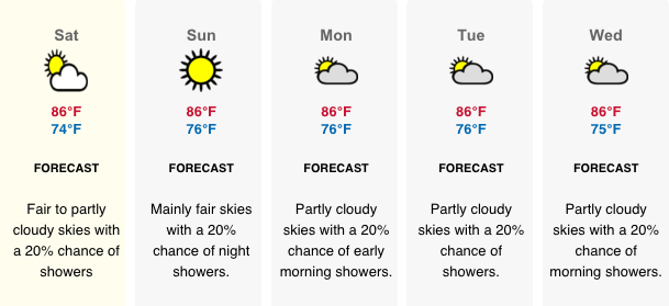 Temperature: Today’s expected temperatures – 77°F to 86°F. Yesterday: H 85.8°F L 76.5°F