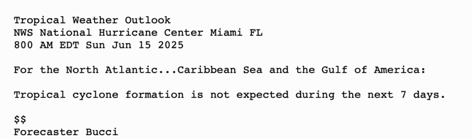 | Tropical Weather Outlook (en Español*) 800 AM EDT Sun June 15 2025 1205 UTC Sun June 15 2025 | |