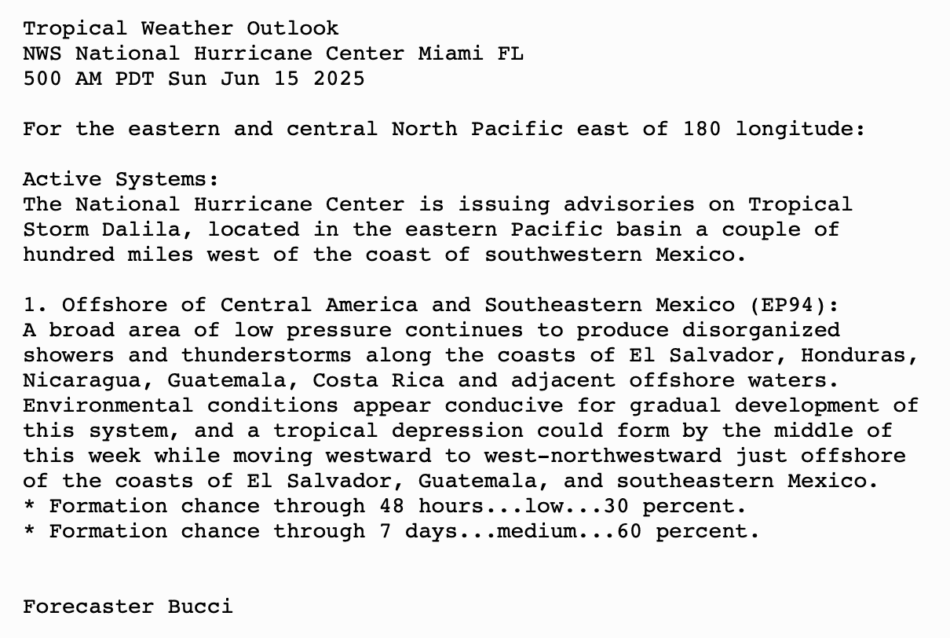 | Tropical Weather Outlook 500 AM PDT Sun June 15 2025 Tropical Weather Discussion 1005 UTC Sun June 15 2025 | |