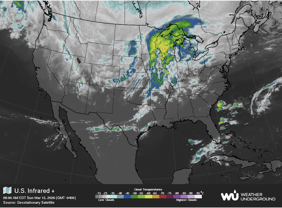 WU/TWC forecast: Tonight: Scattered thunderstorms during the evening. Partly cloudy skies after midnight. Winds: SE at 10 to 15 mph.