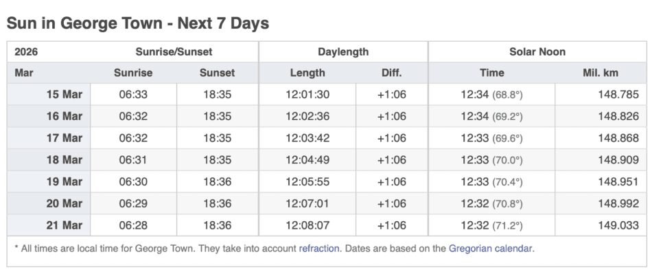 Grand Cayman Sun & Tides Tables March 2026
