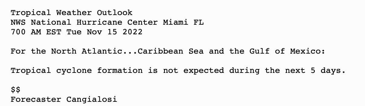 | Tropical Weather Outlook (en Español*) 800 AM EDT Tue Nov 15 2022 1205 UTC Tue Nov 15 2022 | |