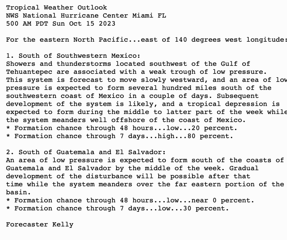 | Tropical Weather Outlook (en Español*) 800 AM EDT Sun 15 Oct 2023 | |