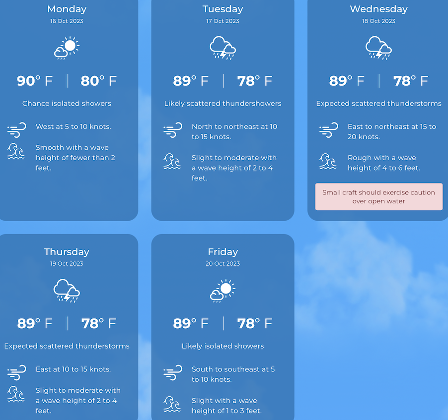 Day: A mix of clouds and sun. Winds Light & variable. Night: Clear to partly cloudy. Winds Light & variable.