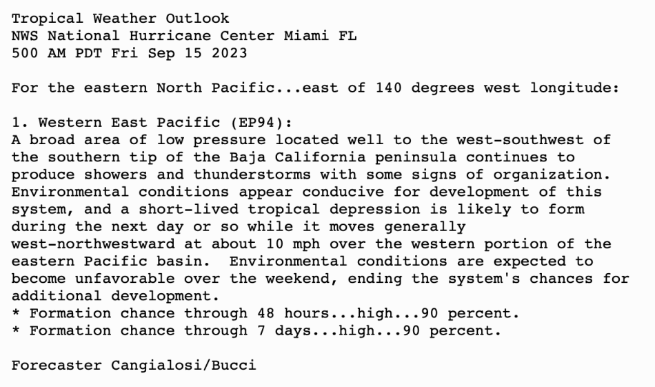 | Tropical Weather Outlook (en Español*) 800 AM EDT Fri Sep 15 2023 | |
