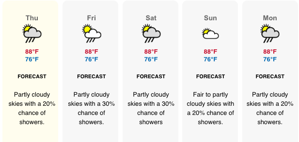 Temperature: Today’s expected temperatures – 77°F to 90°F. Yesterday: H 90.3°F L 77.5°F