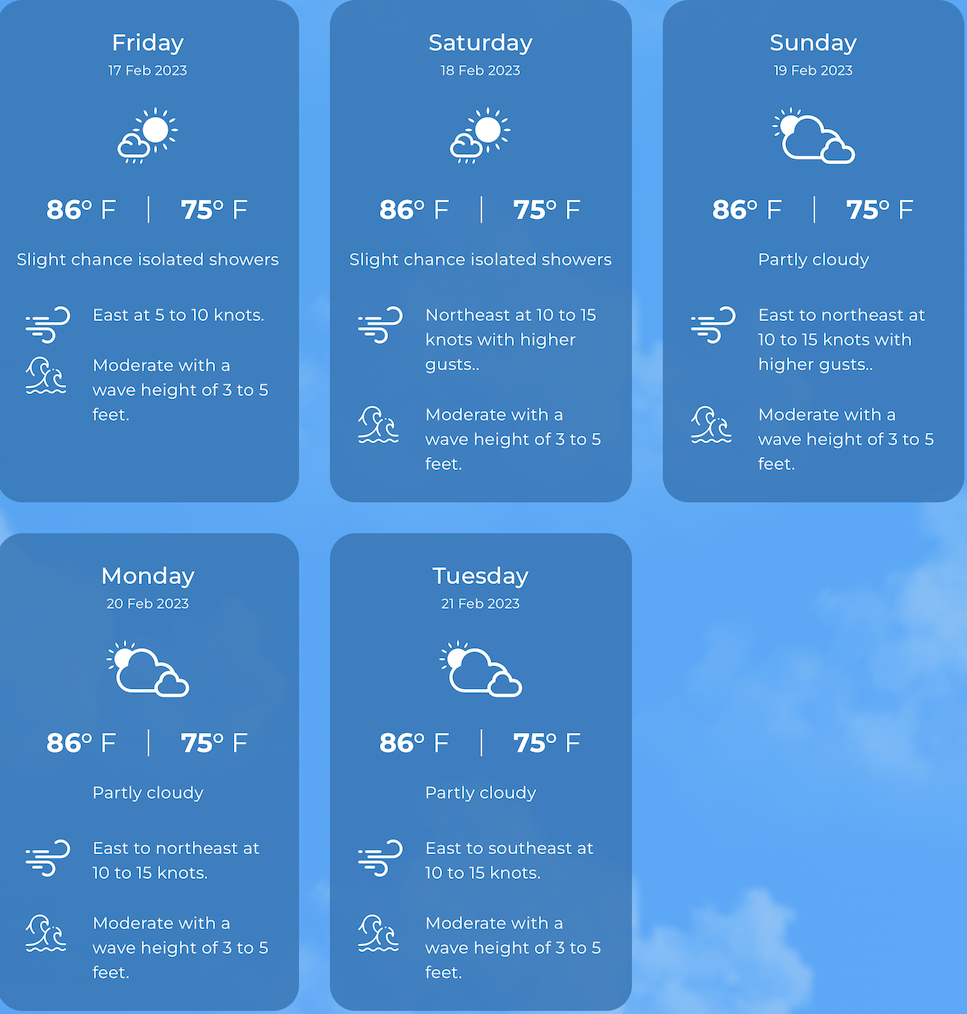 IMPORTANT NOTICEThe times reflected in the tidal table for Grand Cayman are predictions valid as references for sports fishing in areas near the coast of Grand Cayman. THEY ARE NOT SUITABLE FOR NAVIGATION. Remember that to practice any activity at sea like diving, windsurfing and fishing from a boat or underwater fishing should always be consulted with the official tide tables of the port of Grand Cayman.