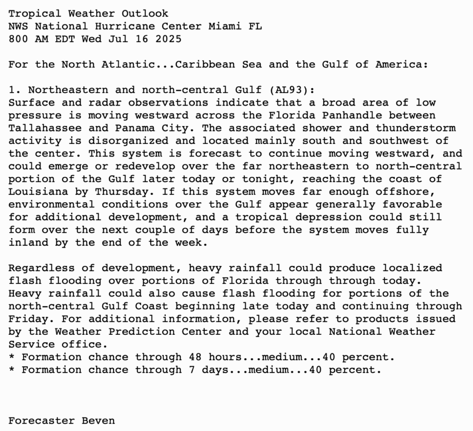 | Tropical Weather Outlook 800 AM EDT Wed 16July 2025 1205 UTC Wed 16July 2025 | |