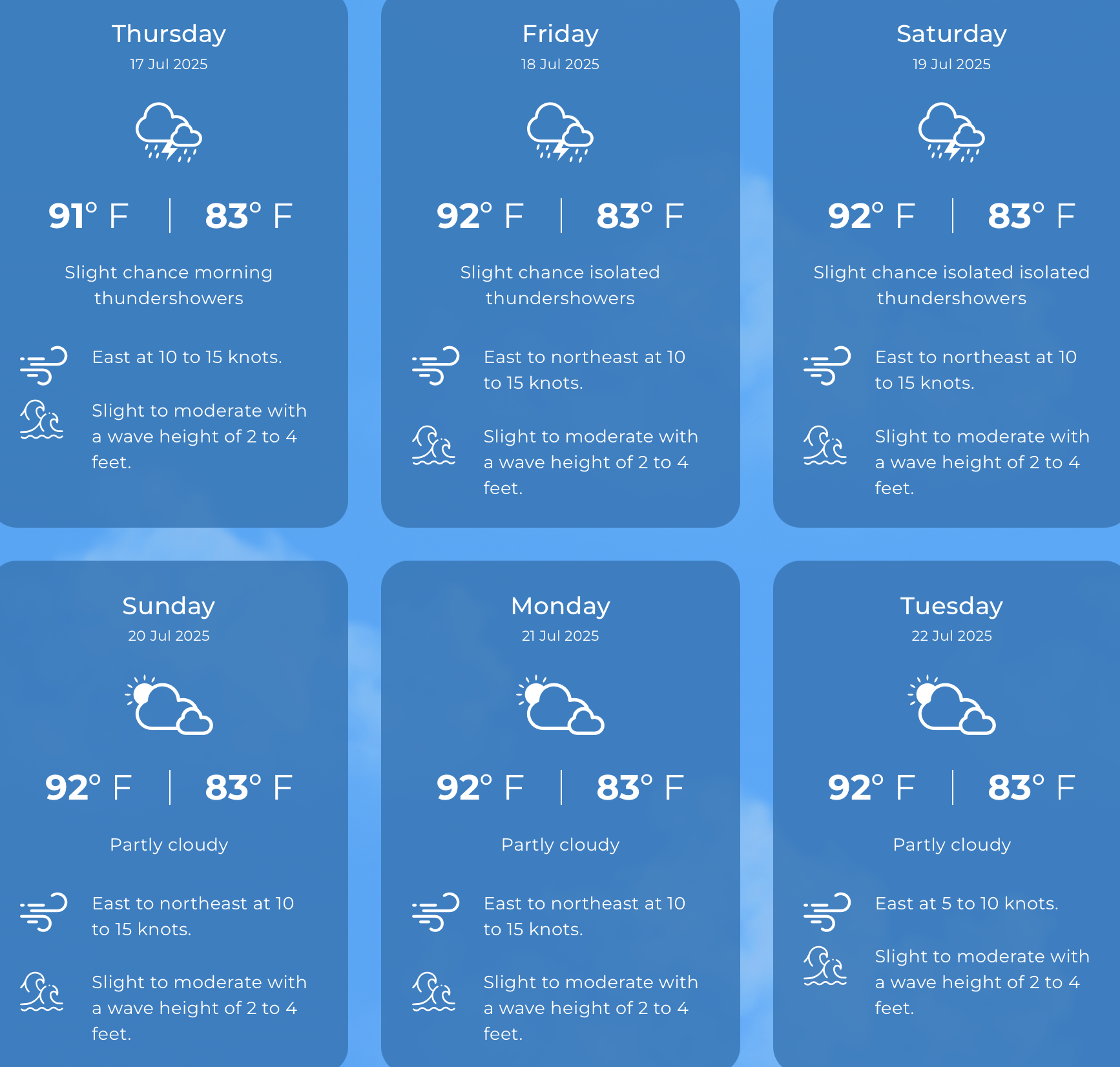 Expected temperatures: 83°F to 91°F. Yesterday: H 93.1°F L 82.9°F