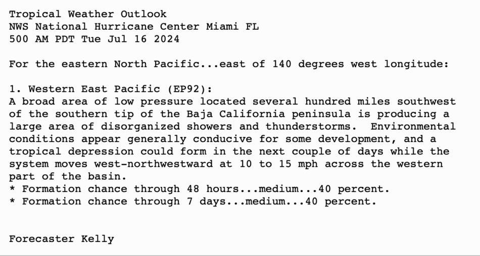 | Tropical Weather Outlook 500 AM PDT Tue 16 July 2024 Tropical Weather Discussion 1005 UTC Tue 16 July 2024 | |