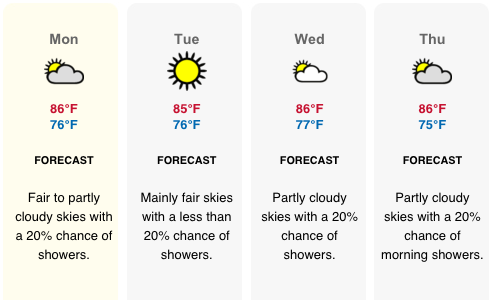 Temperature: Today’s expected temperatures – 73°F to 85°F. Yesterday: H 84.9°F L 73.6°F