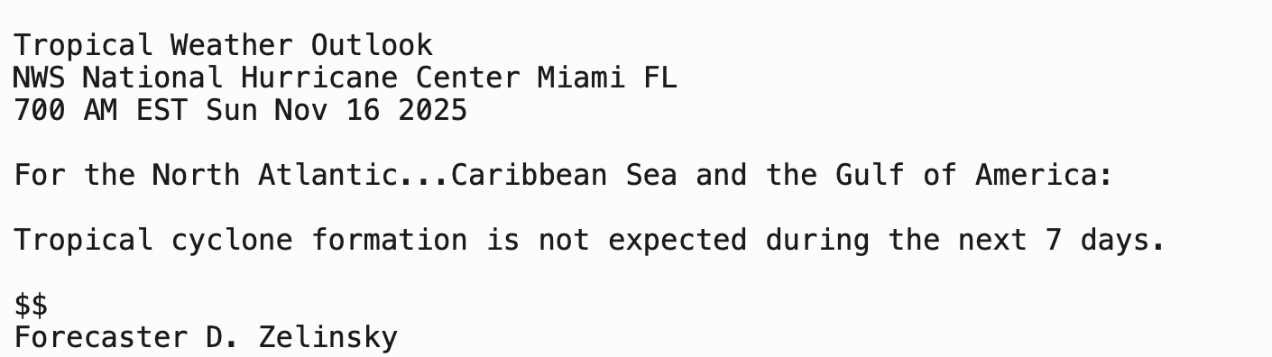 | Tropical Weather Outlook 800 AM EDT Sun 16 Nov 2025 1205 UTC Sun 16 Nov 2025 | |
